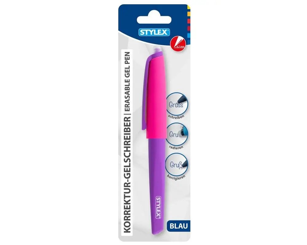 Sauber korrigieren und sofort weiterschreiben: Der Stylex Korrektur-Gelschreiber bietet eine angenehm flüssige Gel-Tinte in Blau, die sich dank des integrierten Radierers an der Kappe rückstandslos entfernen lässt. Fehler verschwinden sofort – und du kannst direkt wieder überschreiben, ohne das Papier zu beschädigen. Eine rutschfeste Gummigriffzone mit Griffmulden sorgt für ein ergonomisches Schreiberlebnis. Schaftfarbe in drei modernen Farben sortiert.