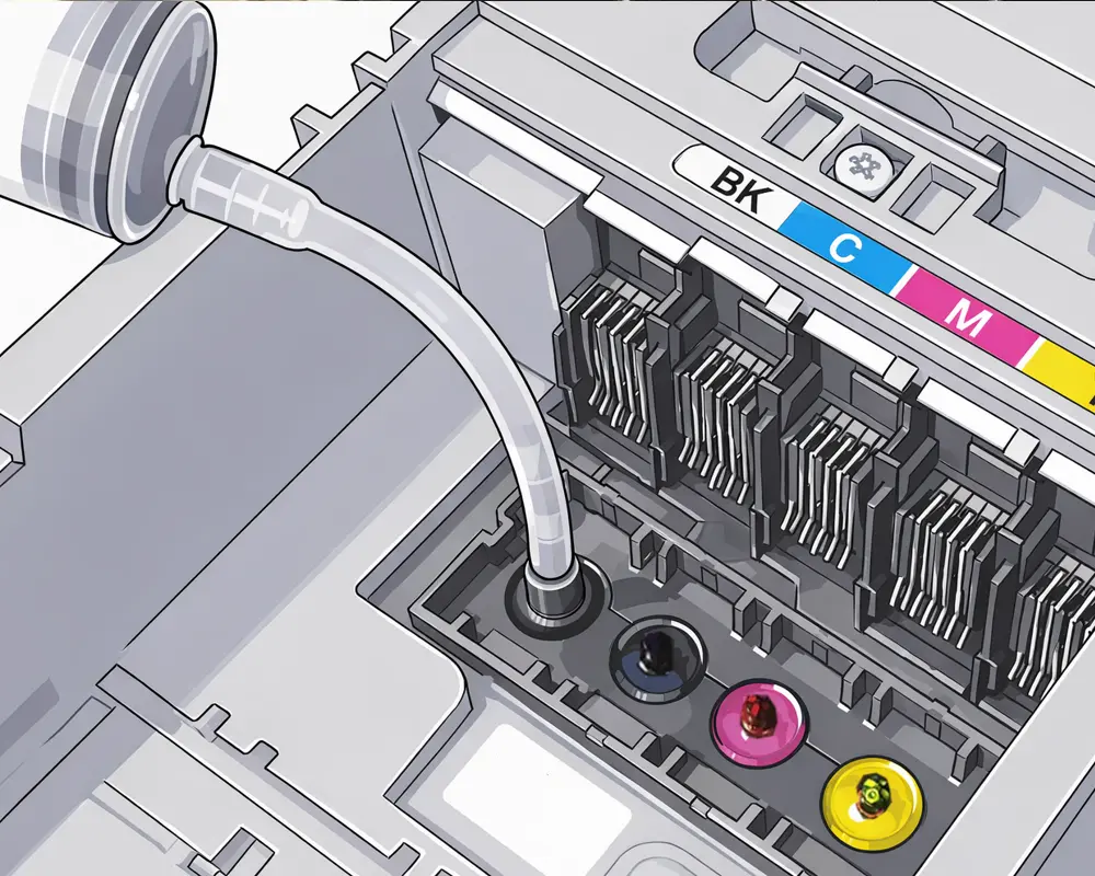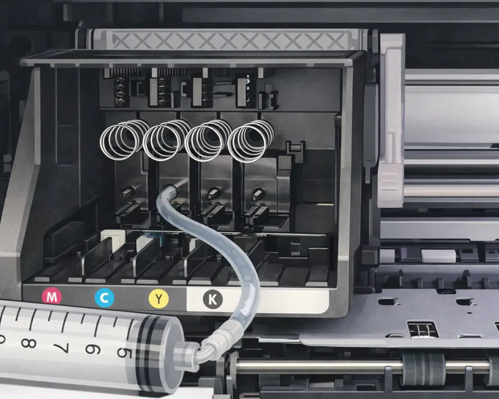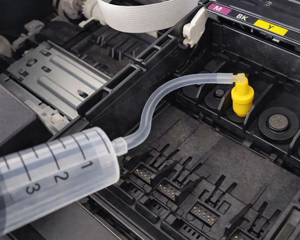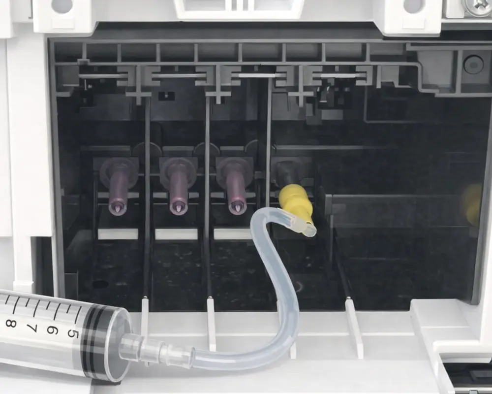 Die Reinigungslösung wird über die Adapter direkt an die Tintenzuführung geführt. Dadurch erreicht sie Bereiche, die mit normalen Software-Reinigungen oder Patronenwechseln nicht zugänglich sind. Besonders bei eingebauten Druckköpfen ist das ein entscheidender Vorteil.