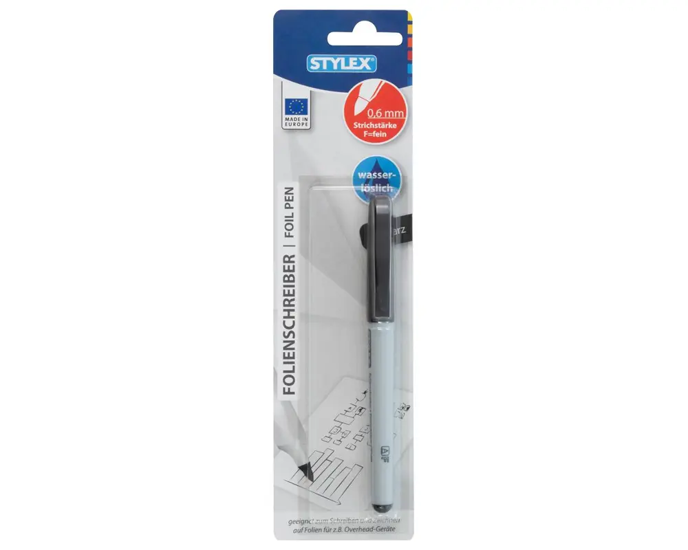 Der Stylex Folienschreiber in Schwarz ist die ideale Wahl für alle, die auf Folien sauber und präzise schreiben möchten. Dank seiner wasserlöslichen Tinte auf Wasserbasis eignet er sich perfekt für Overhead-Folien, Präsentationen, Unterrichtsmaterialien oder technische Zeichnungen. Die feine Strichstärke von 0,6 mm (F) sorgt für klare, gut lesbare Linien.