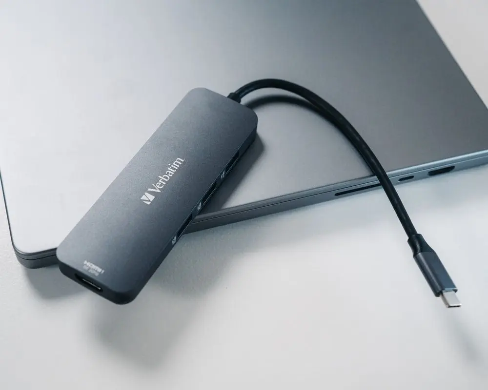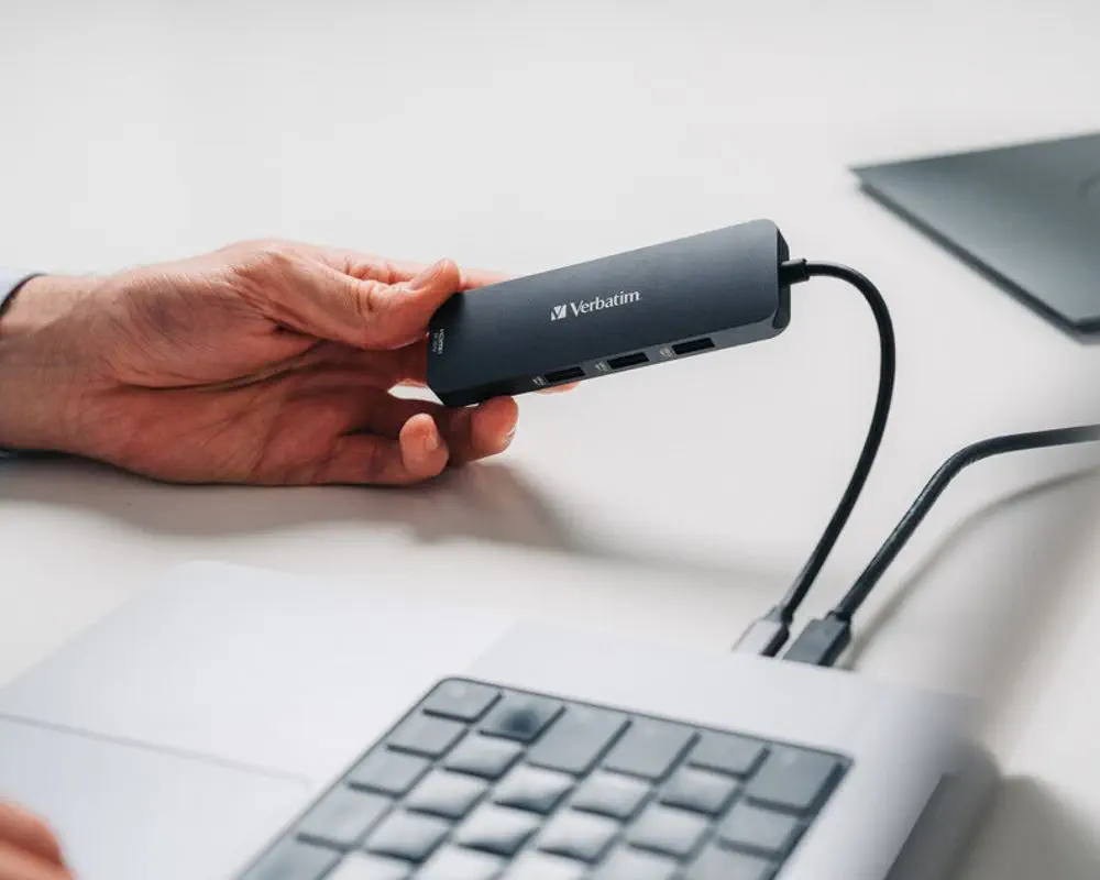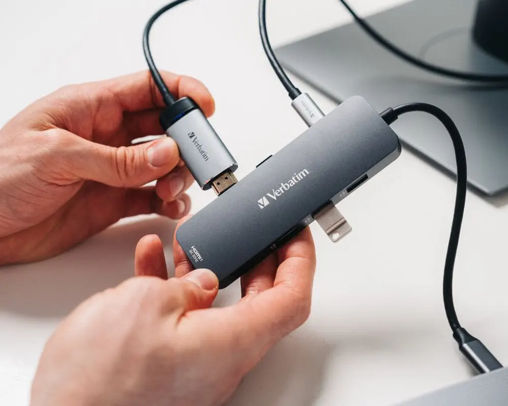 Der Verbatim USB-C® Pro 8-Port Multiport-Hub bietet bis zu acht umfangreichen Anschlussmöglichkeiten für die nur eine USB-C Ansteckmöglichkeit benötigt wird. Für zwei externe Monitor ist dieser Multiport von Verbatim mit 1 HDMI-Anschluss in 4K-Qualität bei 30Hz ausgestattet und einer sogar bis zu einer Auflösung von 8K. Perfekt für Präsentationen, Filme-Streaming oder zum Erweitern deines Desktops auf einen größeren Bildschirm. Zusätzlich besitzt der Multiport 3 USB-A 3.2 Gen 1 mit einer Datenrate von bis zu 5 Gbit/s und 1 USB-C PD Anschluss1 SD 3.0- und microSD 3.0-Kartenleser, ein Muss für Kreative ubnd Profis. Verwandeln Sie mit dem USB-C Pro 8-Port Multiport-Hub von Verbatim Ihren Laptop in eine Multimedia-Station. Das einzige was Ihr Gerät benötigt ist ein USB-C Anschluss.