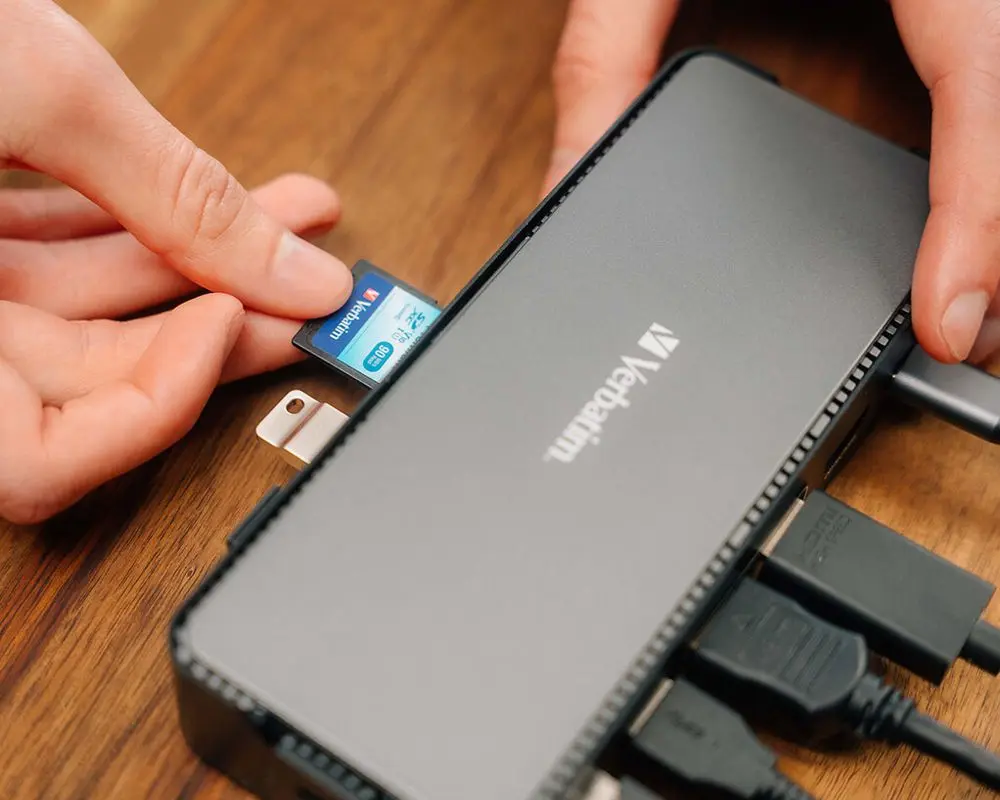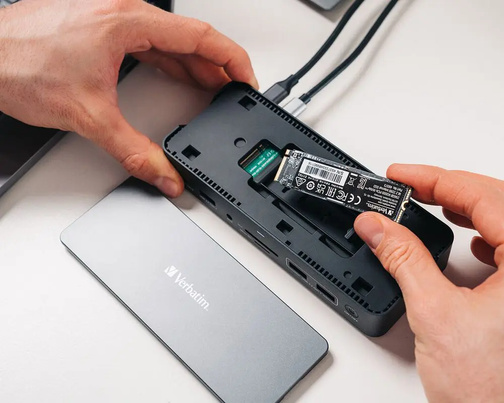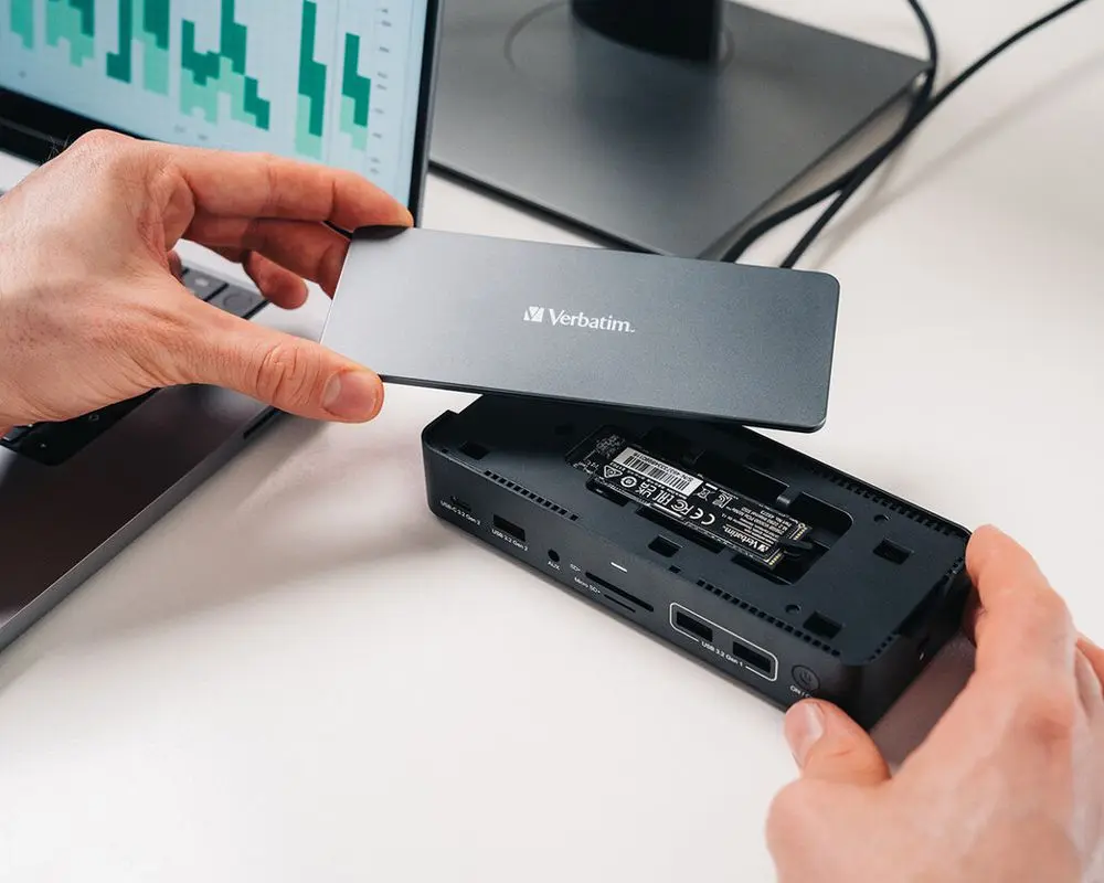 Mit der Verbatim USB-C Pro Dockin Station haben Sie die Möglichkeit über 15 Anschlüsse mit nur einem Kabel via USB-C anzuschließen. Zusätzlich befindet sich in der Verbatim USB-C Pro Docking Station einen M.2 SSD-Slot. Wählen Sie dazu einfach eine beliebige interne M.2 NVMe PCIe (10 Gbit/s) oder SATA (5 Gbit/s) SSD und optimieren Sie ganz problemlos Ihren Datenspeicher und -zugriff. Zu den Anschlüssen zählen 3 HDMI-Ports für externe Monitore, mehrere USB-A und USB-C Slots, 1 MicroSD und SD-Kartensteckplatz, 1 Audioanschluss, 1 Netzwerkanschluss und einen zusätzlichen USB-C PD Anschluss für ununterbrochenes Laden. So kann der Laptop mit bis zu 100W geladen werden – und gleichzeitig können alle anderen Anschlüsse genutzt werden. Die USB-A-Anschlüsse unterstützen weder Apple SuperDrive/Nintendo Switch noch das Laden von iPads und anderen Tablets.